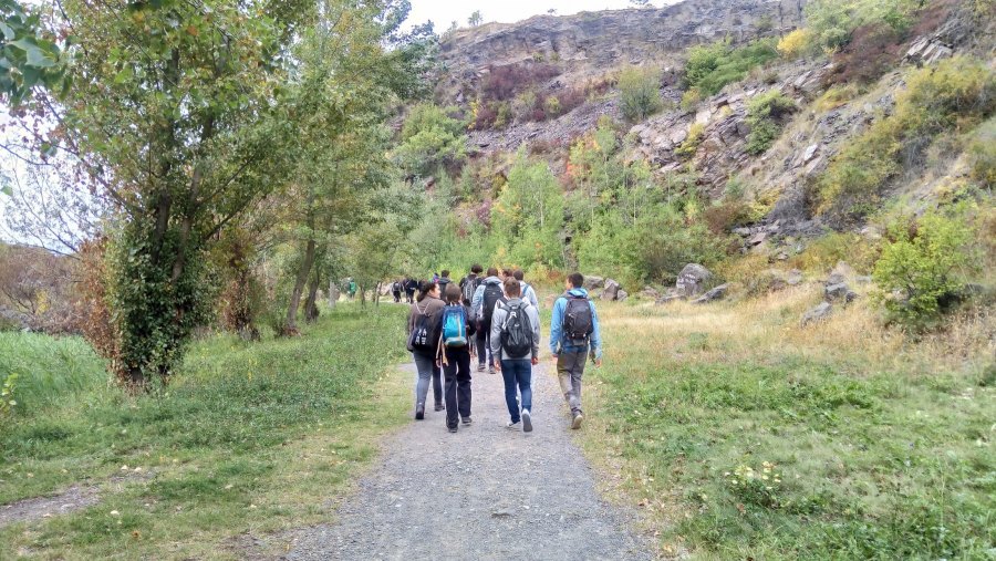 Negyedórás pihenő után folytattuk utunkat lefelé Tarcal irányába, először műúton, majd erdei úton haladtunk lefelé. Fél órán belül már az erdőt is magunk mögött hagytuk és a tarcali szőlősön át haladtunk a Tarcali bányató és az Áldó Krisztus szobor felé. Útközben vadon hagyott szőlőt, vadalmát, kökényt és diót is kóstoltunk. Lent a faluban friss vizet öntöttünk kulacsainkba és a Kopasz-hegyet ÉNY-i irányból támadtuk meg. A lösz mélyutak labirintusa lenyűgöző volt a szőlőparcellák között. Újra elértük az erdőt, majd a műútra rátérve már a délelőtti útvonalon haladtunk egy ideig. Most nem mentünk fel a TV-toronyig, hanem a sípályát alacsonyabban átszelve értünk ki a tokaji oldalra. A gerincen végig haladva letértünk balra és a temető felől közelítettük meg Tokaj központját. Útközben kétszer ijesztett ránk az eső, de végül szárazon megúsztuk a túrát. A központban egy-két percre álltunk be az eresz alá, hogy esőkabátot vegyünk elő megint, de mindez a készülődés is hasztalan volt: az eső nem akart eleredni. A vonatállomásig unalmasabb kövezett városi útszakaszon haladtunk. Az állomáson jólesően pihentünk meg és falatoztunk a vonat érkezéséig. Felszálláskor záporesőben volt részünk, de kit érdekelt az eső így a vonatra kapaszkodás közben. Páran nyomban elszenderedtek a közel 19 km gyaloglás után, de mindez jóleső érzéssel töltött el mindannyiunkat.