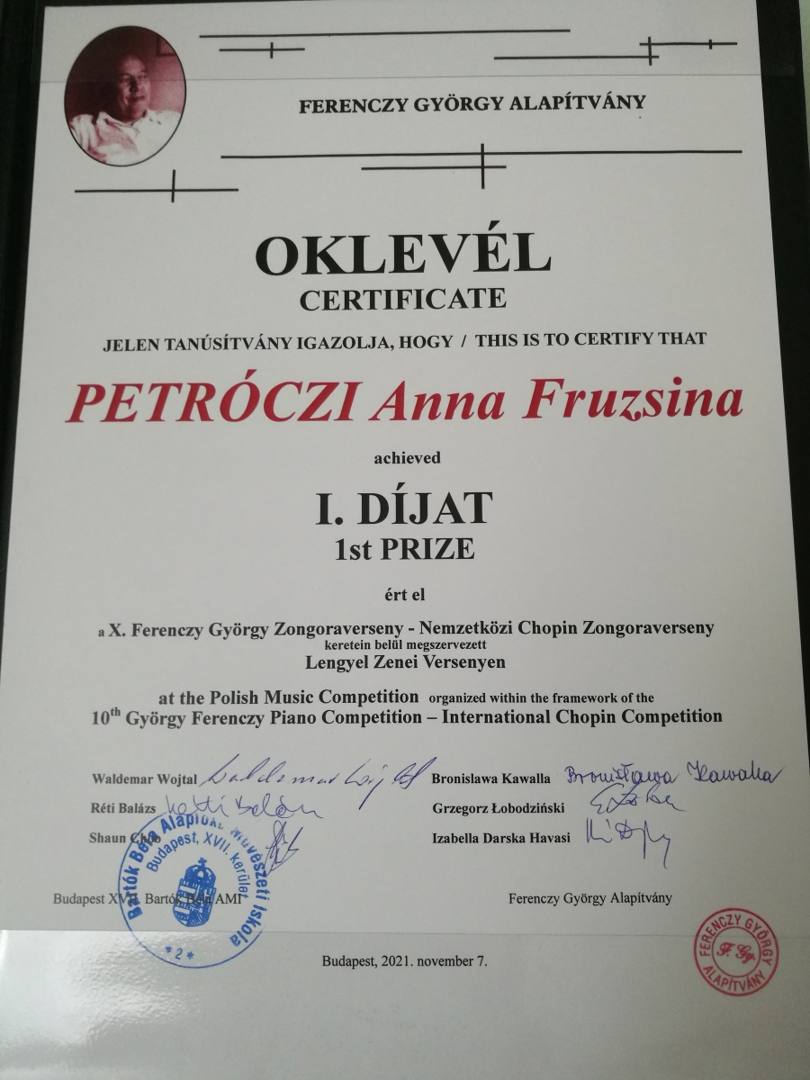 Diákunk a nemzetközi zongoraverseny első helyzettje
