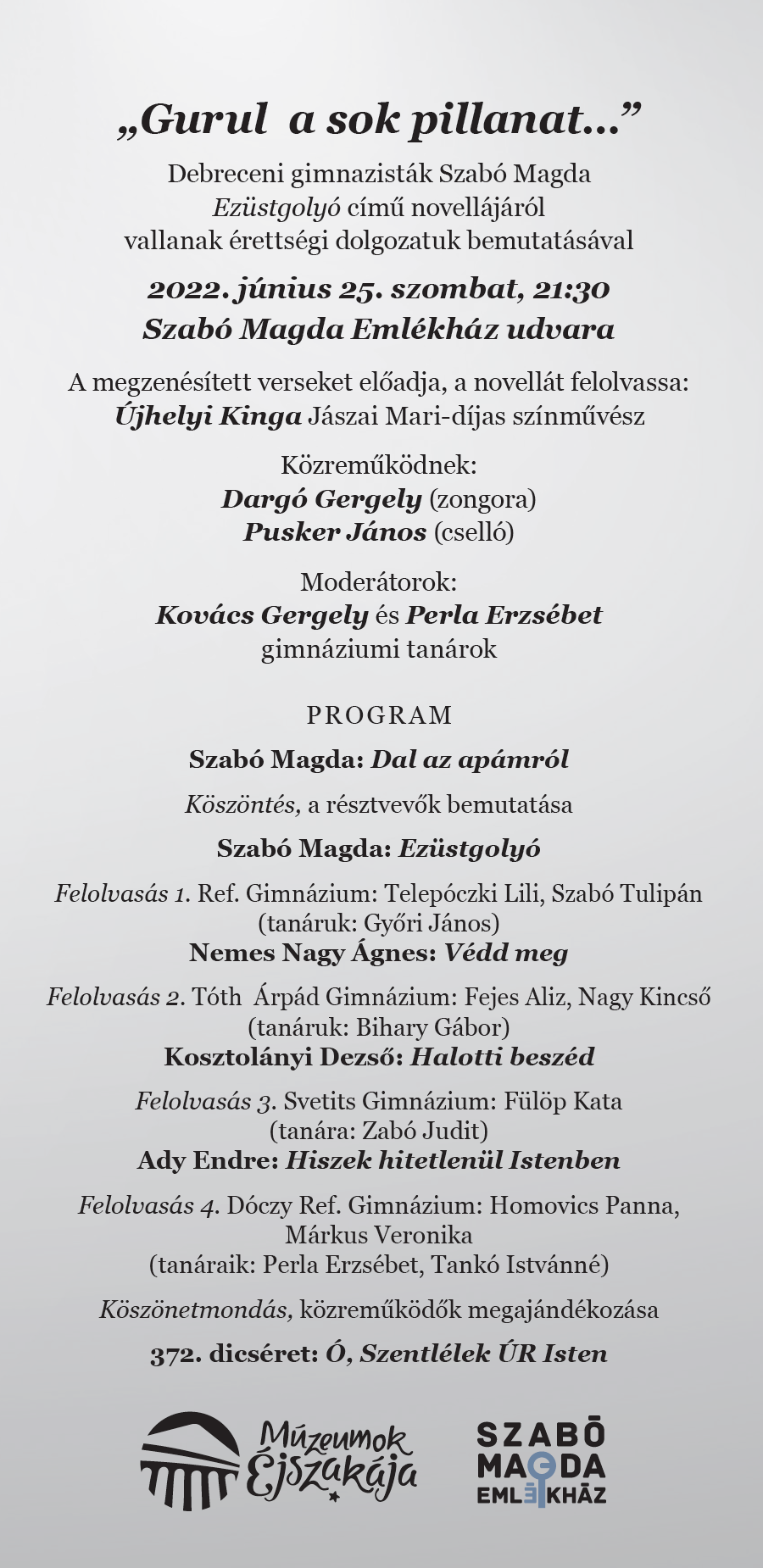 „GURUL A SOK PILLANAT” címmel néhány diákunk érettségi dolgozata felolvasásra kerül a Múzeumok Éjszakáján június 25-én a Szabó Magda Emlékház udvarán a zenés irodalmi est keretében, továbbá Bálint Ágnes és Égerházy László könyvebemutatóján népdalénekeseink is közreműködnek.