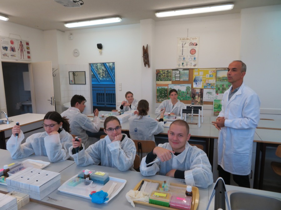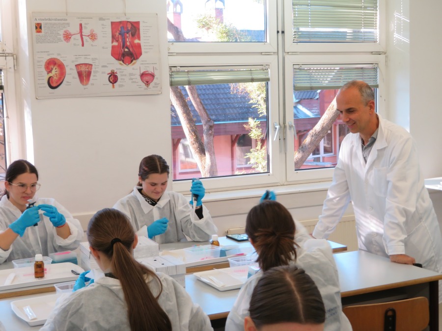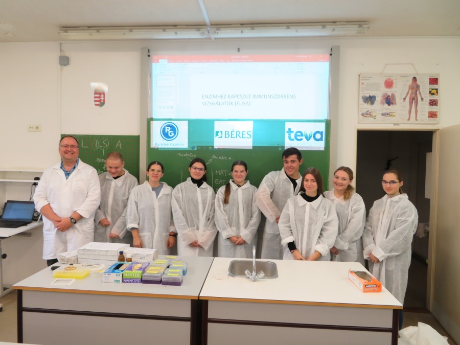 A biológia tagozat 9 diákja nyomozott az ELISA segítségével az antigének és az antitestek után a Tóth Árpád Gimnázium gyakorlatán. A Nemzeti Tudós Akadémia regionális központjában Gőz József tanár úr ismertette meg a diákjainkat az ELISA (enzyme-linked immunosorbent assay) módszerrel, amivel antigéneket és antitesteket lehet kimutatni, de ezt használják a terhességi teszteknél is. A pipettázás közben megismerkedtünk az ELISA két változatával is (indirekt, szendvics). A molekuláris biológia fontos módszere tovább bővítette a tanulóink ismereteit. Köszönjük a lehetőséget!