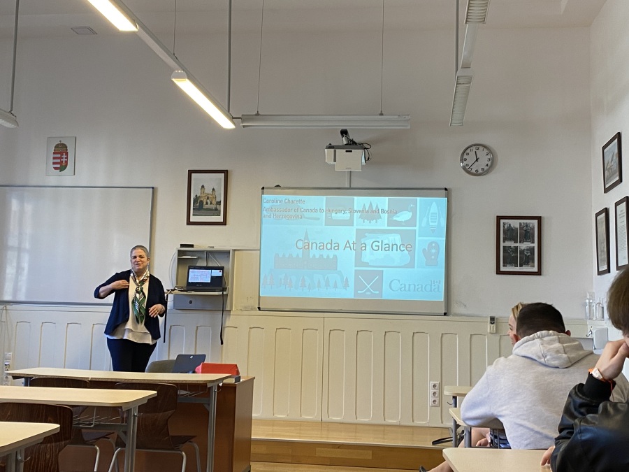 Caroline Charette, Kanada magyarországi nagykövete tett látogatást gimnáziumunkban. Diákjaink nagy lelkesedéssel hallgatták sokszínű országa kultúrális értékeiről, földrajzi adottságairól, történelmi múltjáról szóló beszámolót és az ott élők hétköznapjairól szóló érdekességeket.