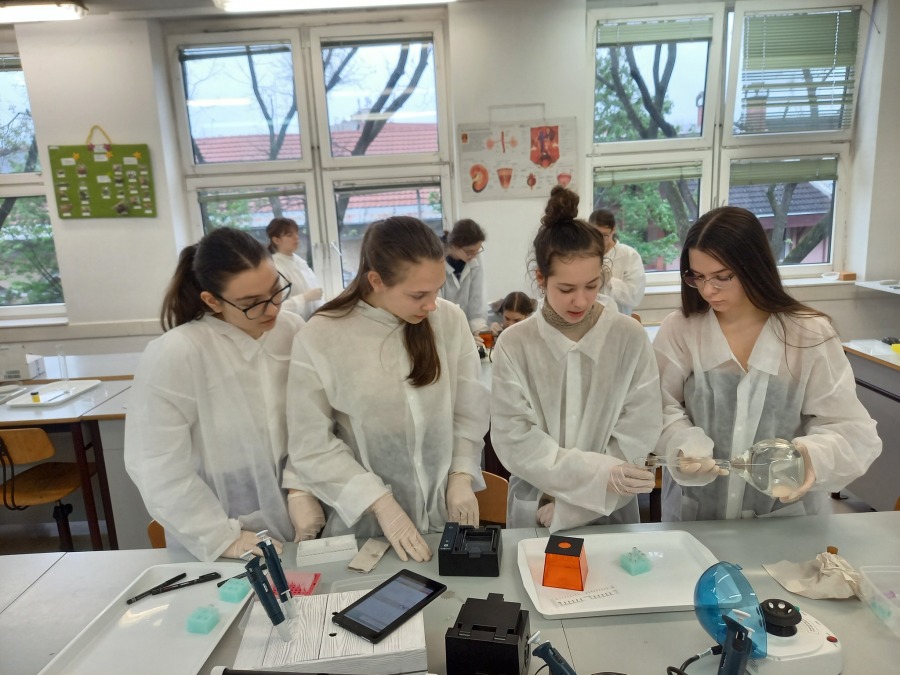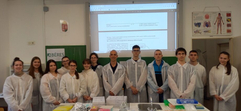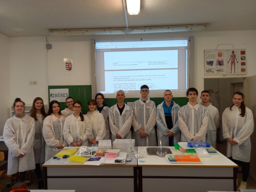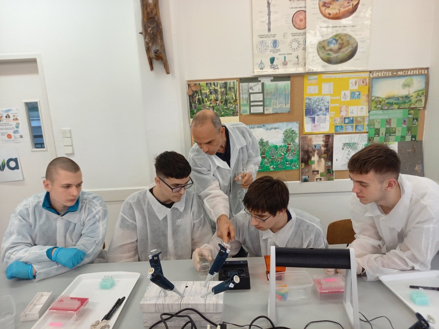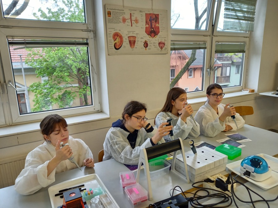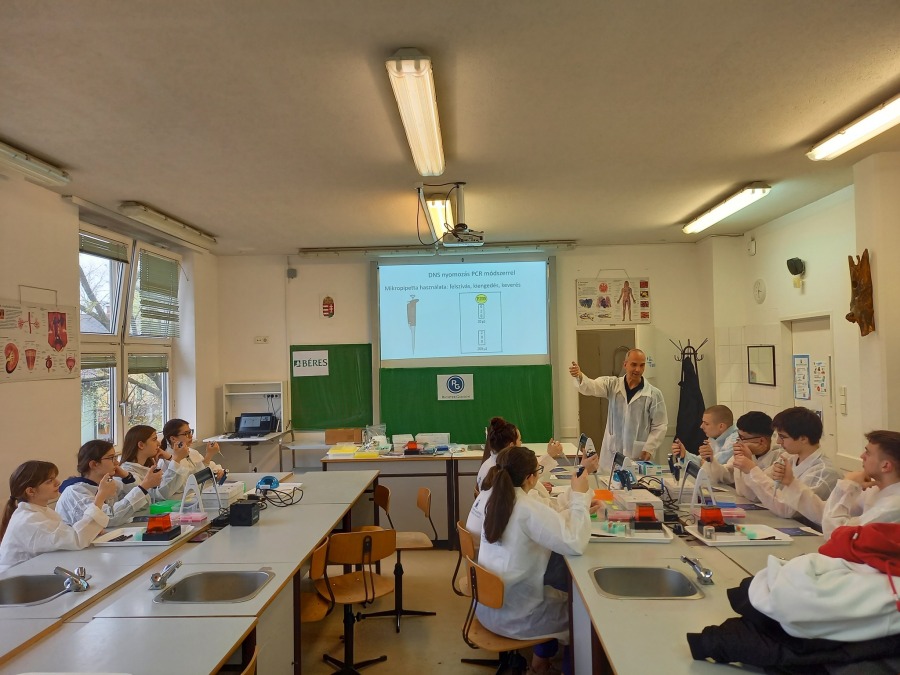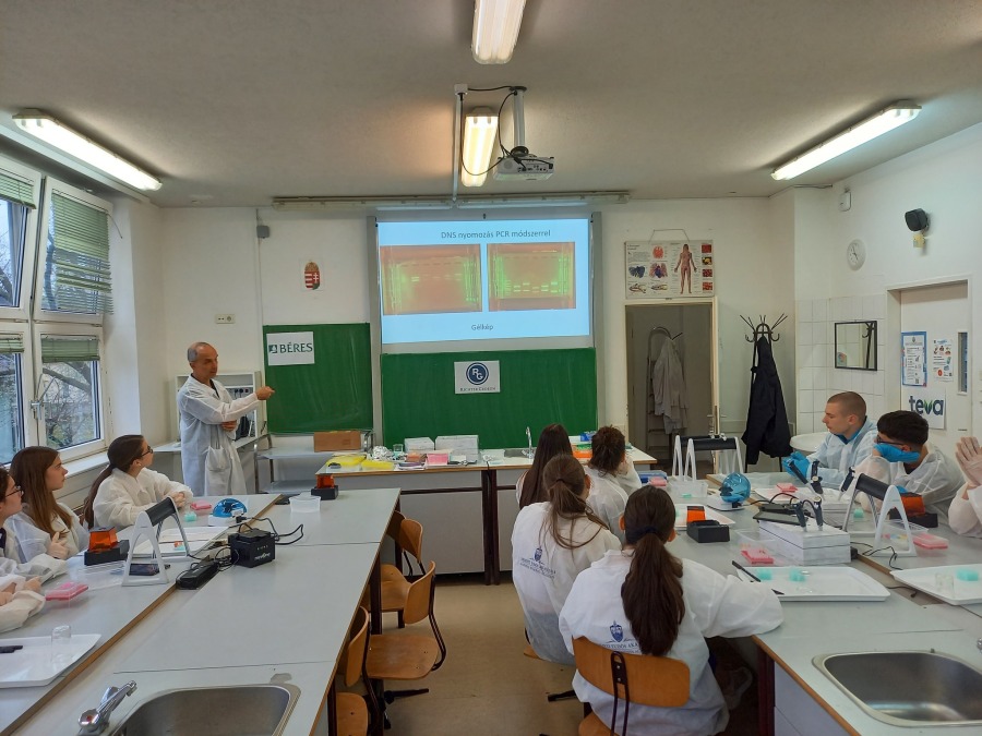 A 10. évfolyamos biológia-kémia tagozat biológia szakkörösei a Nemzeti Tudós Akadémia regionális központjában, a Tóth Árpád Gimnáziumban molekuláris genetikai gyakorlaton vettek részt. Gőz József tanár úr vezetésével a mikropipetta használatát tanulhatták először meg, majd megismerkedhettek a PCR készülék, és a laborcentrifuga működésével. A feladat egy virtuális bűntény kiderítése volt, hiszen a „gyilkos” a tett helyszínén hagyta a DNS-ét. A „nyomozás” sikere a gélelektroforézis segítségével vált valósággá.