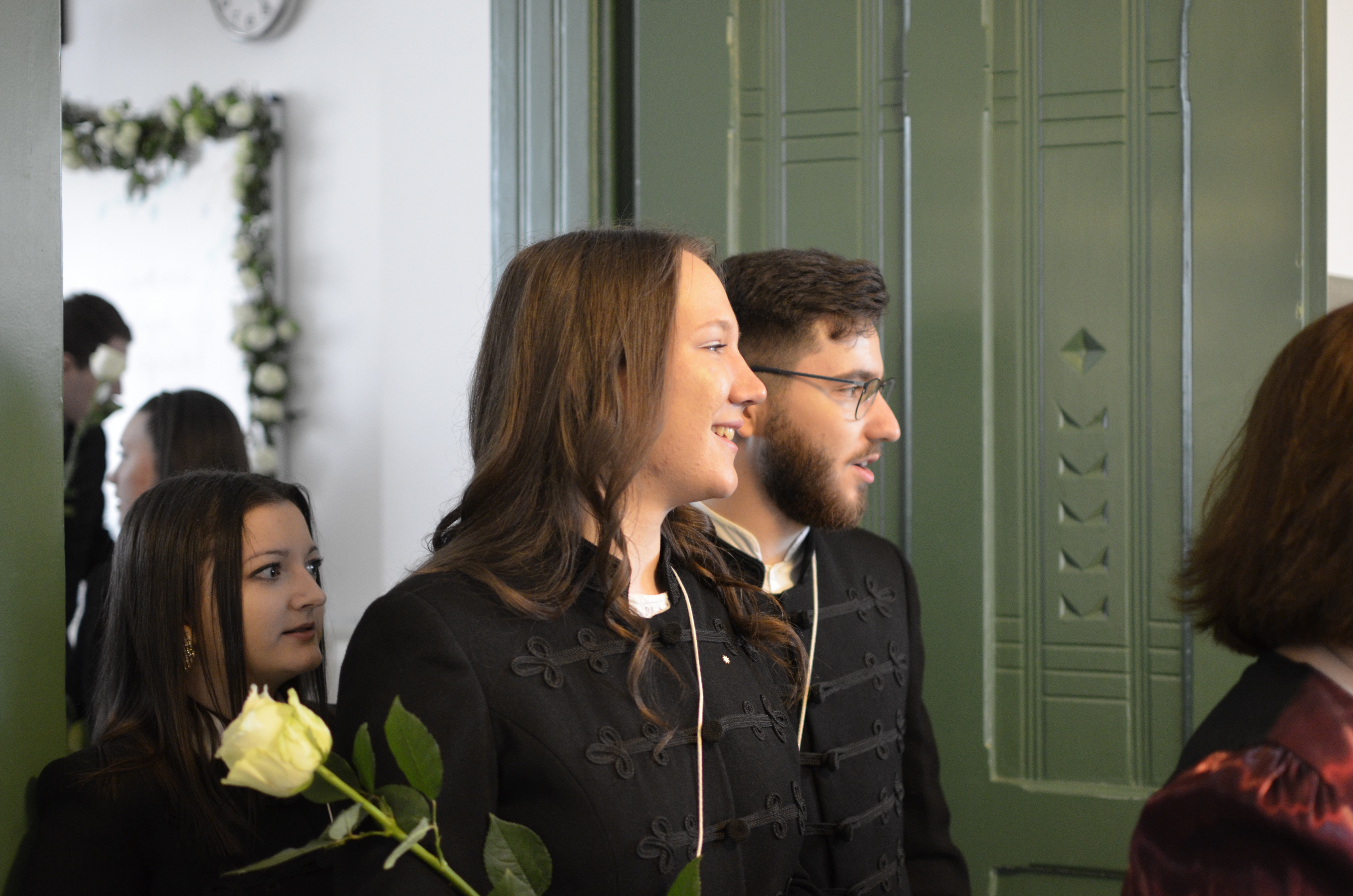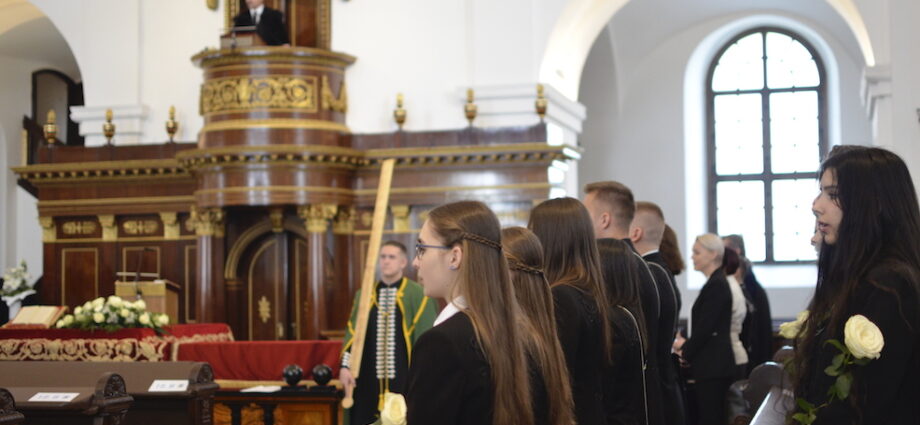 A Nagytemplomban már a családtagok jelenlétében folytatódott az ünnepség. Vezető vallástanárunk, Fehér Norbert, a hívő ember példaadó felelősségére hívta fel a megjelentek figyelmét Timótheus példája alapján. Ahogyan a fiatalok kezében lévő rózsa szirmai befelé, a középpont felé néznek – mondta – úgy kellene nekünk is az Úr felé, mint az életünk középpontja felé fordulni, és szavain tájékozódni.
