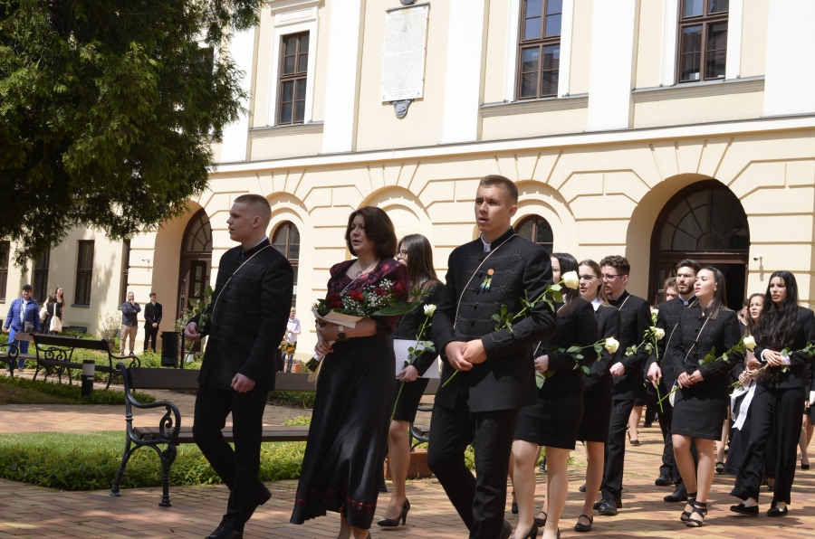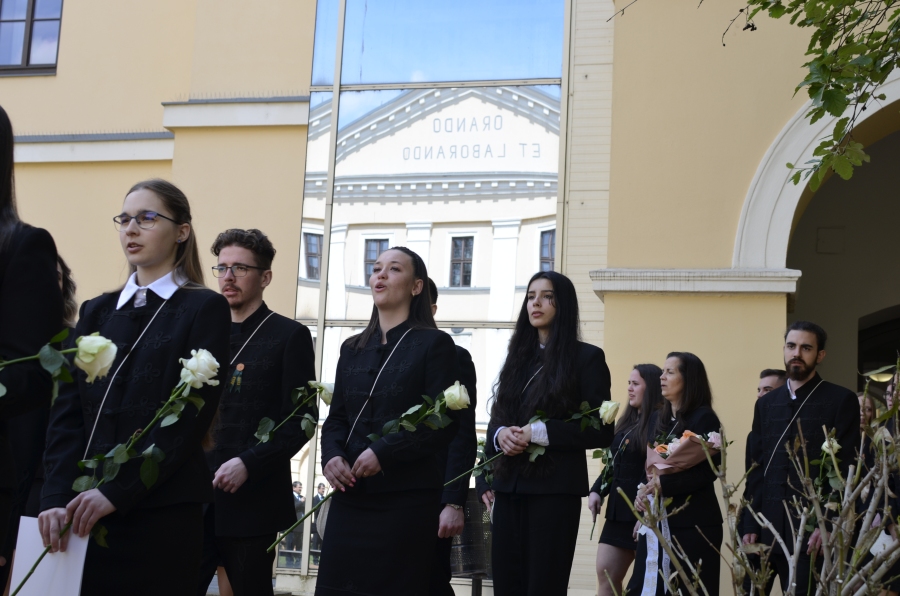 Igazgatónő, Ivánné Nagy Erzsébet Bernadett megemlékezett arról, hogy egy olyan évfolyamtól köszöntünk el, amelyben a szív és az együttérzés volt a meghatározó a tanulmányokon túl. Felelevenítette hogyan bátorították egymást a járványhelyzet alatt és után, majd a háború kitörésekor a menekültek között végzett önkéntes munkát és a szíriai földrengés után az általuk kezdeményezett adománygyűjtést. A kimagasló verseny és tanulmányi, illetve sport eredményeiért jópár diák átvehette az Orando et Laborando Alapítvány díjait.