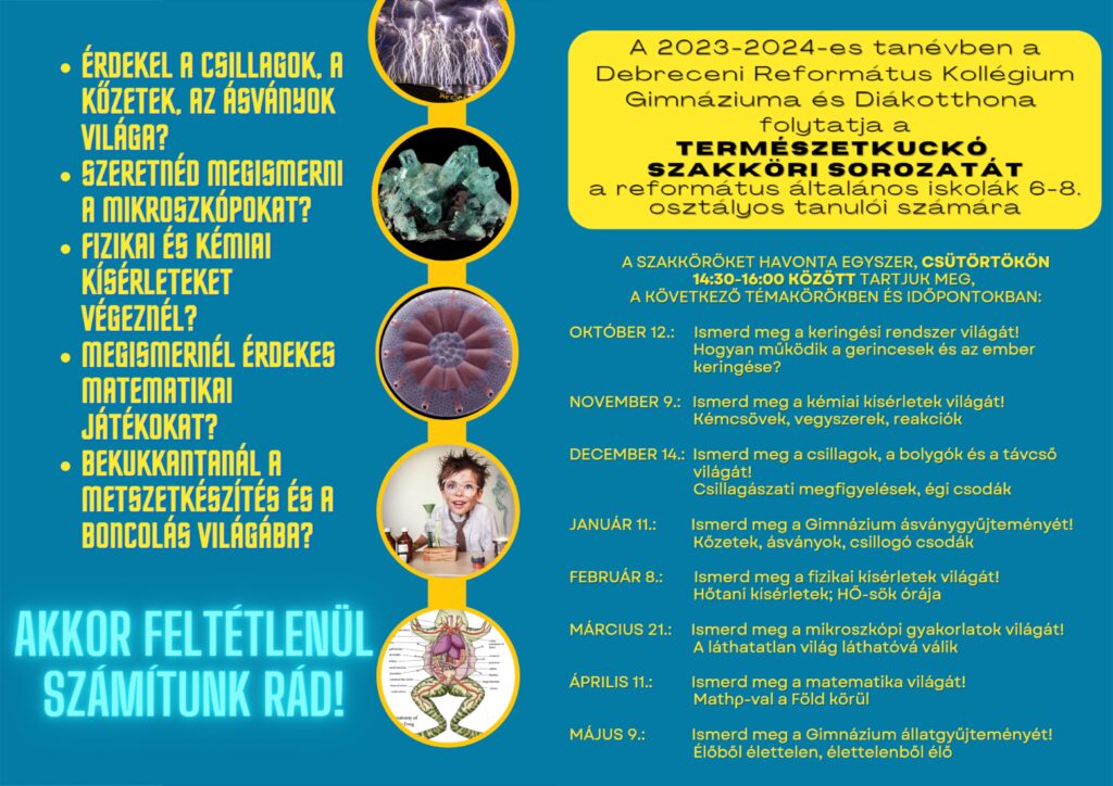 Idén ismét megnyitja kapuit a kísérletek csodálatos világa iskolánkban. Szeretettel várjuk a hatodik, hetedik és nyolcadik osztályos, természettudományok iránt érdeklődő kisrefis és kölcseys diákokat.