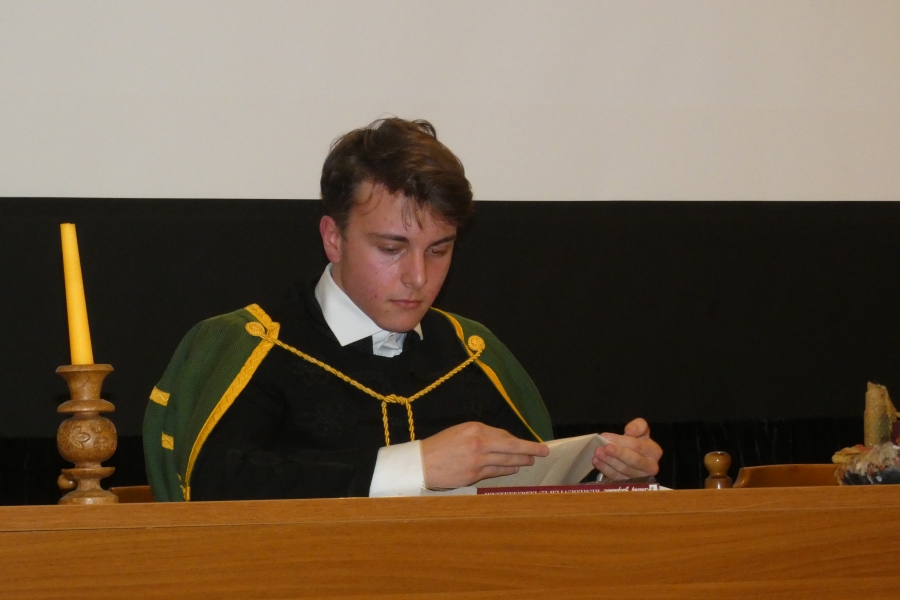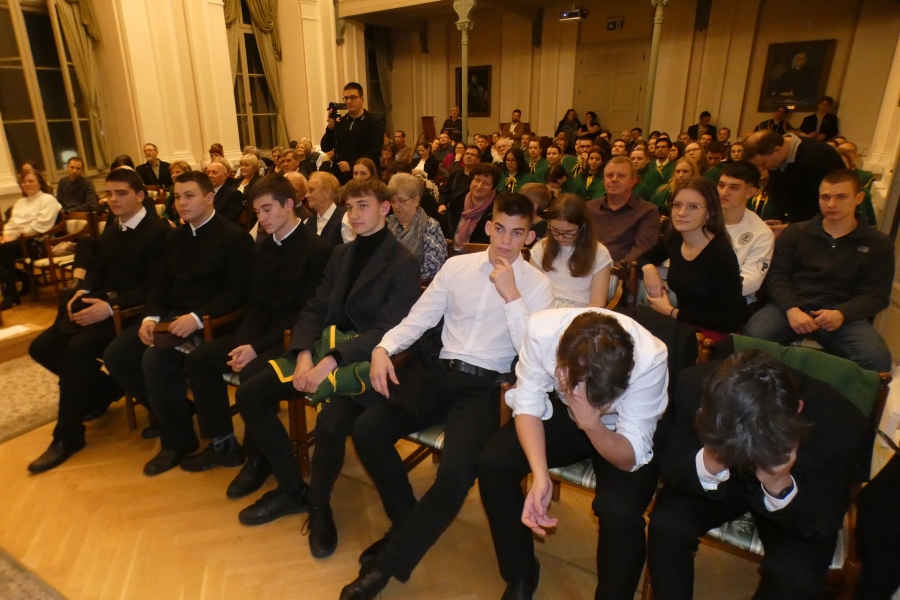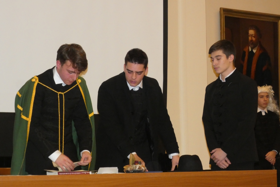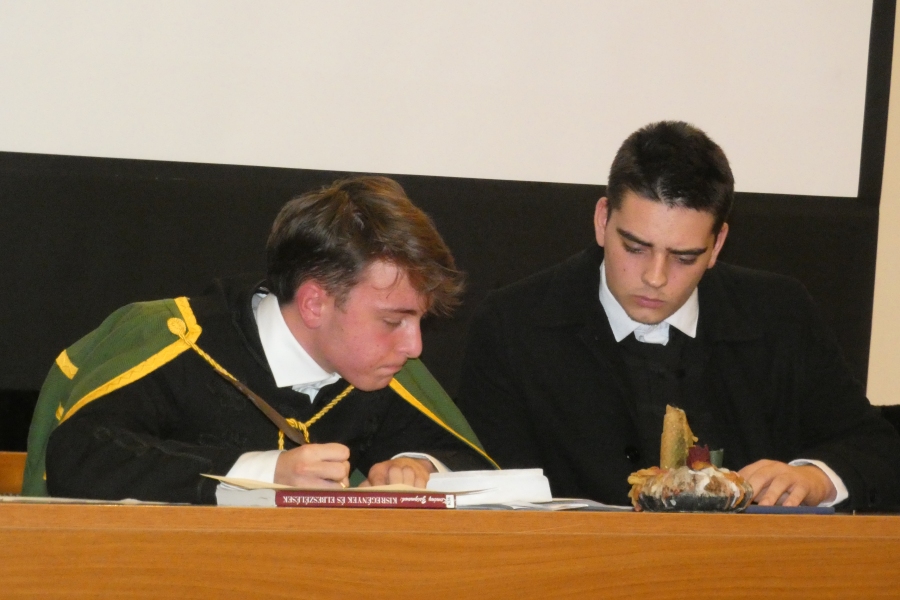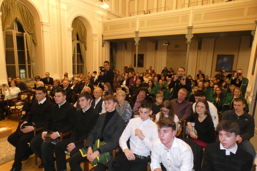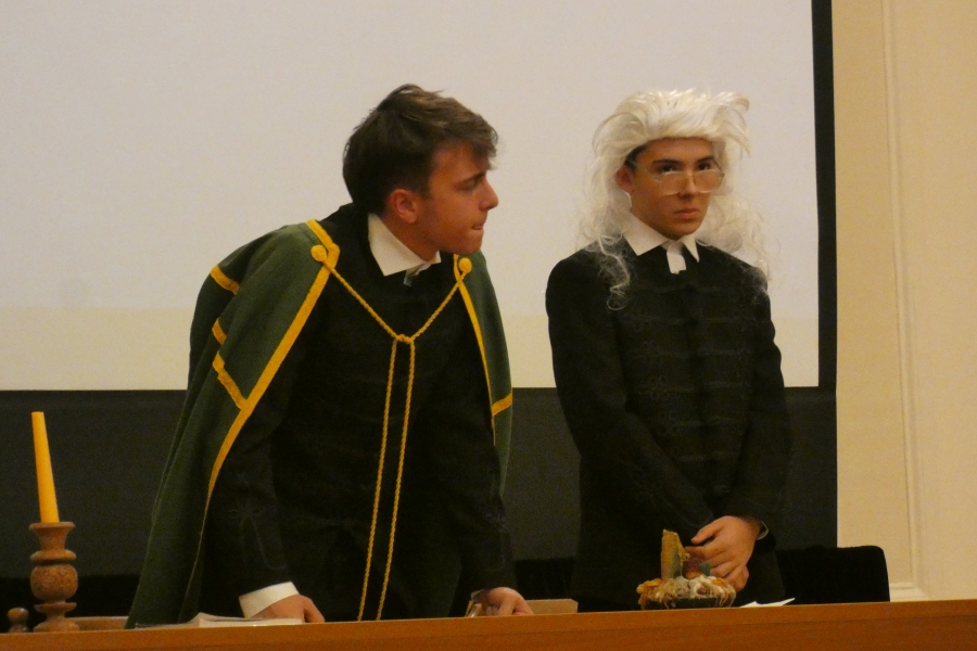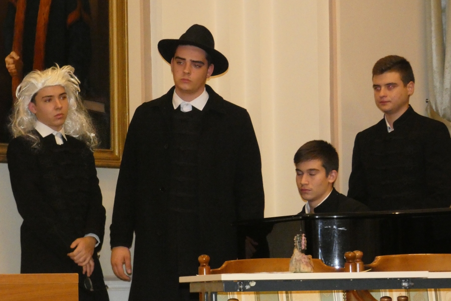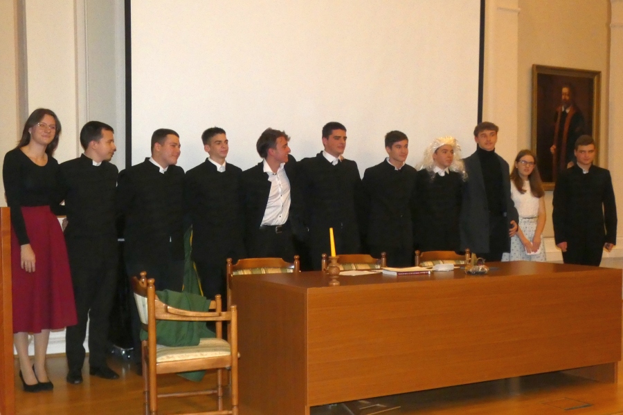 Az egykori premier archív felvételeinek megtekintését követően ugyanis tanulóink rendkívül jó hangulatú előadással tették az összegyűltek számára még felejthetetlenebbé a múltidézést. A darab gerincét alkotó tárgyalást, humort és komolyságot remekül váltakoztatva vitték színre. A közönség együtt nevethetett a Csokonait vádló Szilágyi professzor kikarikírozásán és érezhette át a döntéshozók nehéz helyzetét Budai professzor és Domokos Lajos főbíró úr dilemmáit látva.