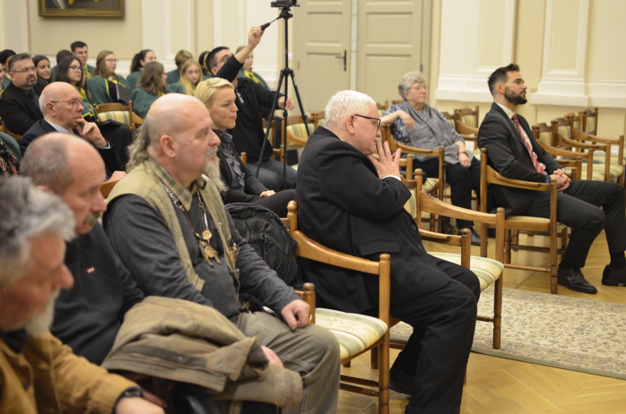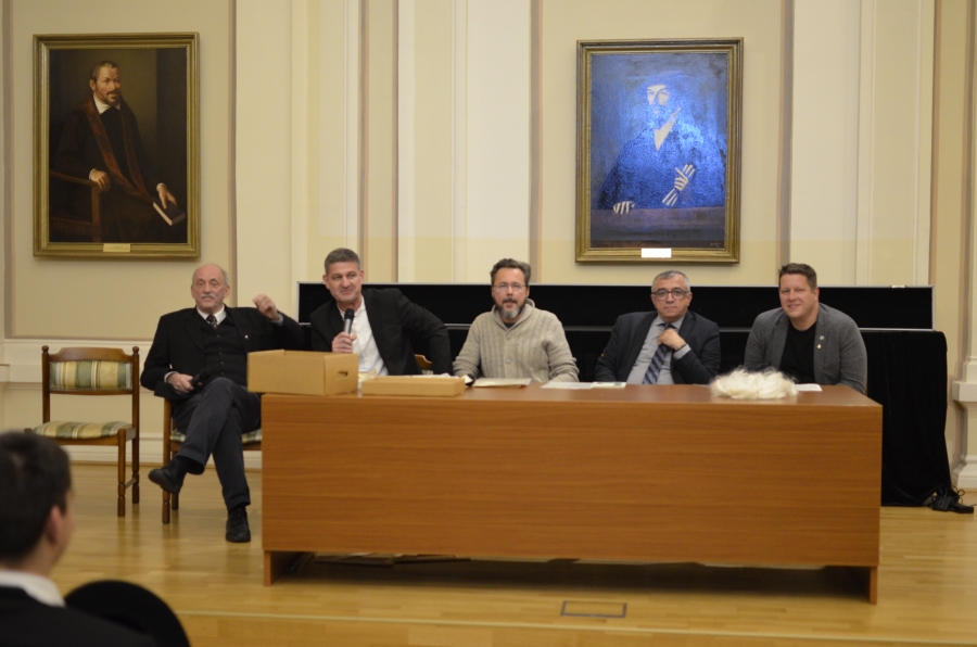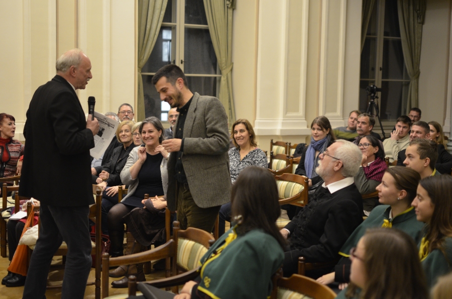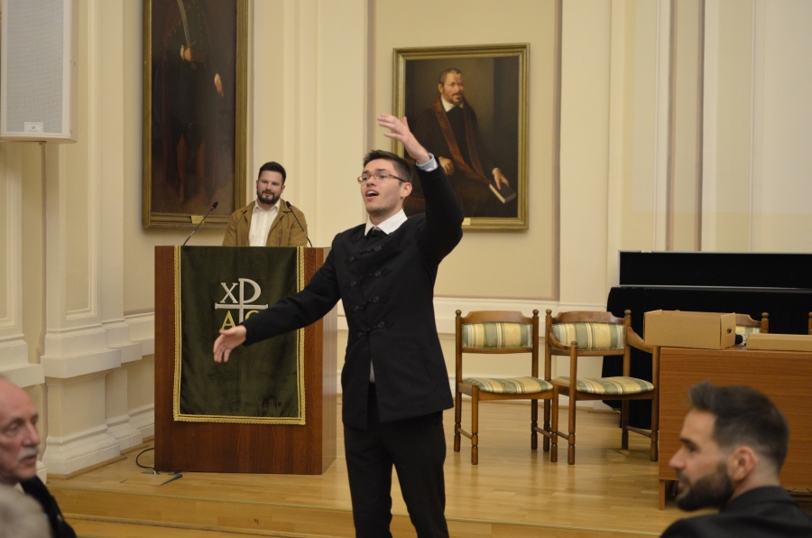 Az egykori premier archív felvételeinek megtekintését követően ugyanis tanulóink rendkívül jó hangulatú előadással tették az összegyűltek számára még felejthetetlenebbé a múltidézést. A darab gerincét alkotó tárgyalást, humort és komolyságot remekül váltakoztatva vitték színre. A közönség együtt nevethetett a Csokonait vádló Szilágyi professzor kikarikírozásán és érezhette át a döntéshozók nehéz helyzetét Budai professzor és Domokos Lajos főbíró úr dilemmáit látva.