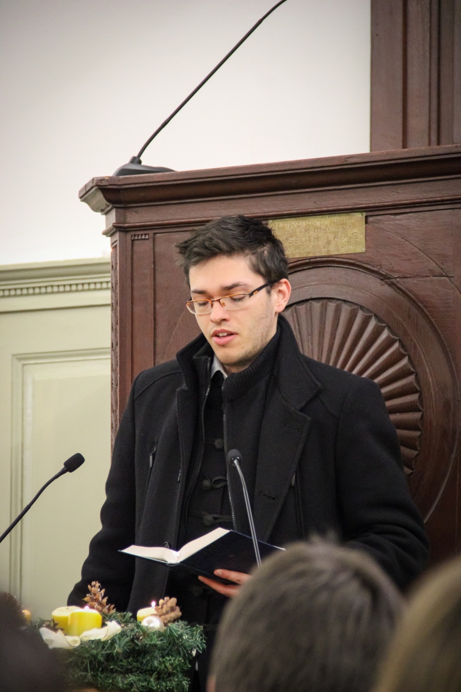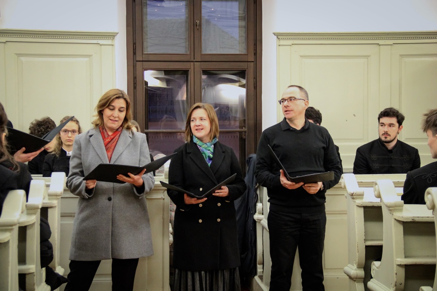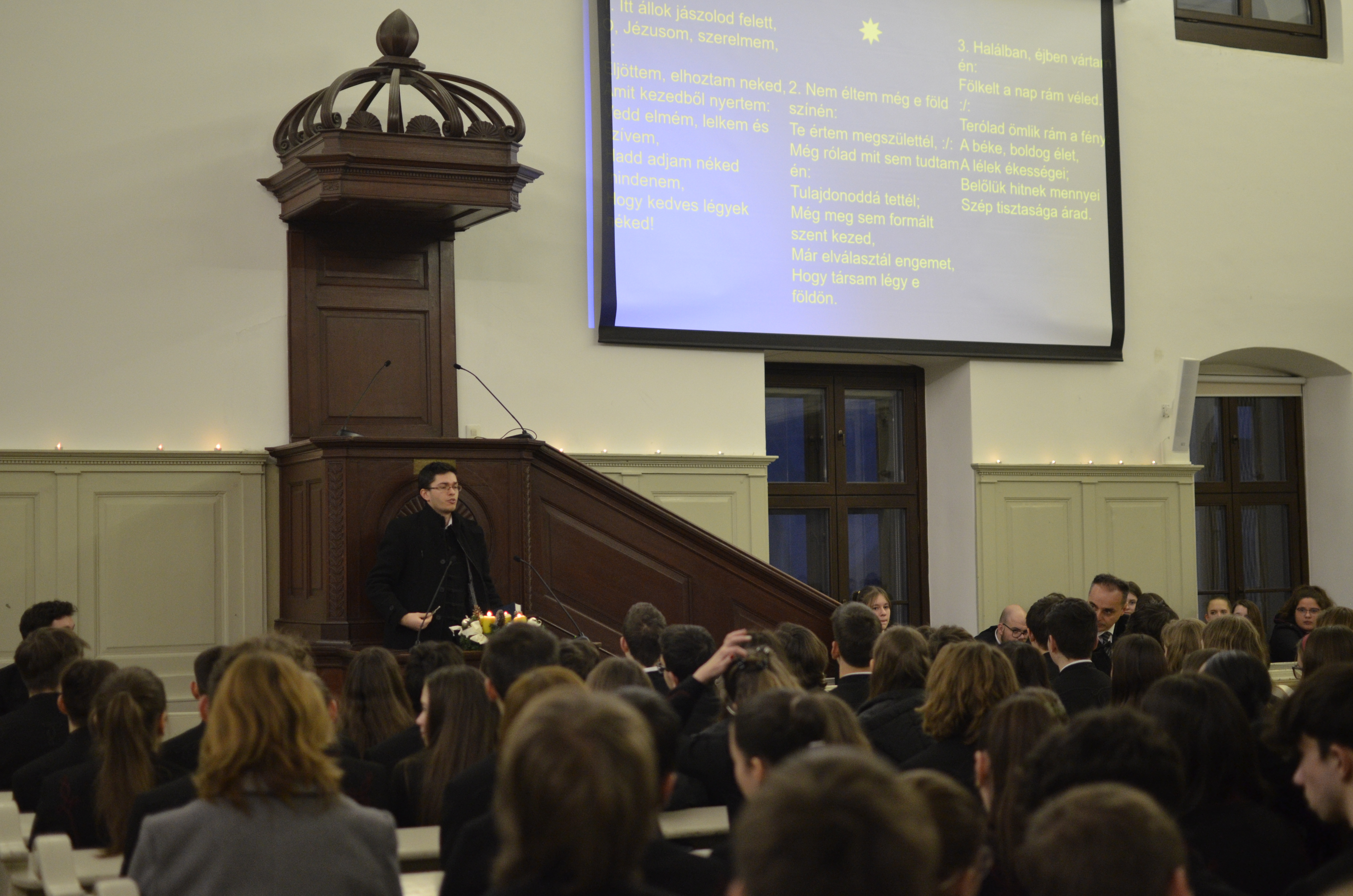 A téli szünet előtti utolsó estén mindig egy lelkileg és érzelmileg gazdag, gyertyafényes meghitt hangulatú istentiszteletre gyűlünk össze az Oratóriumban, amelyet végzős vallás fakultációs diákjaink műsora színesít. Ezúttal nem csupán az általuk elhangzott versek és gondolatok tették emlékezetessé az alkalmat, hanem a 12.A-s fiúk éneke, sőt a tanári kvartett karácsonyi dallamai is.