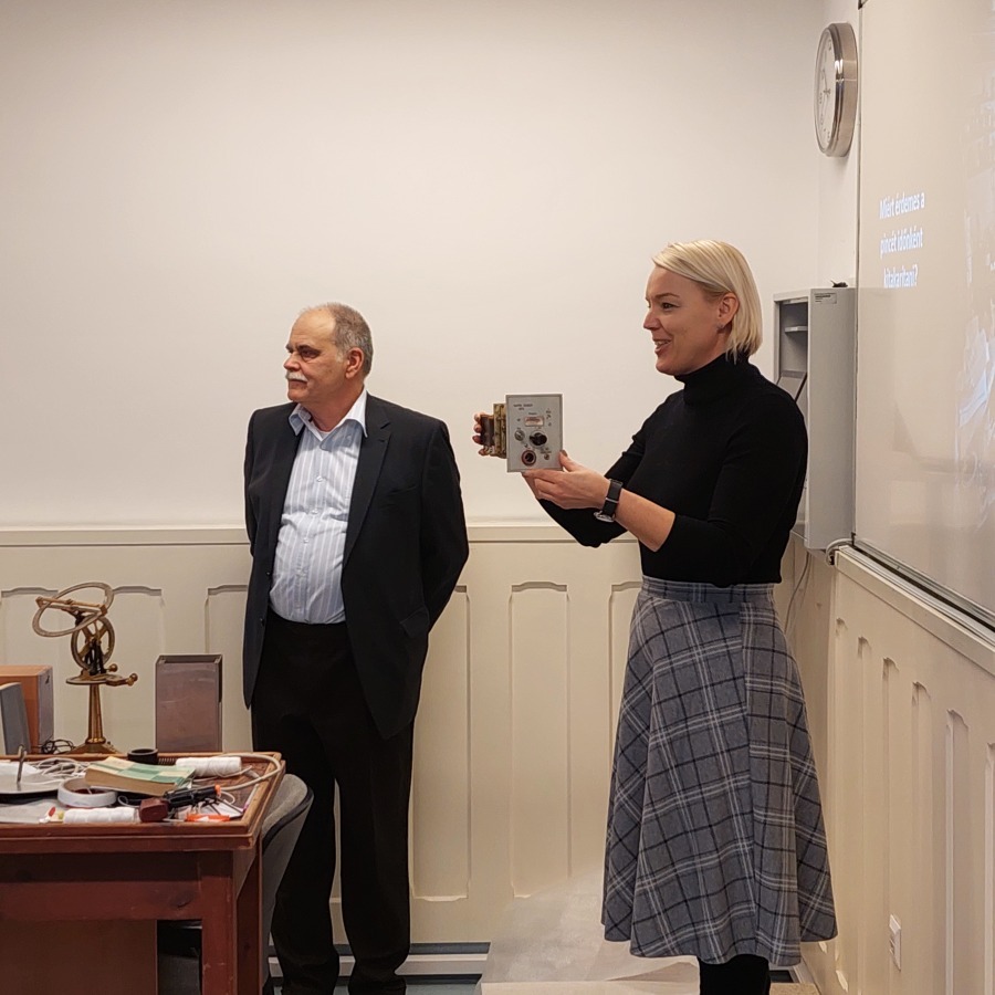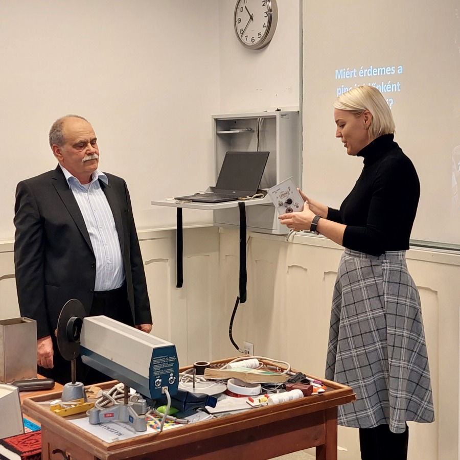 Barta Gábor a készülékről tartott előadást a pályaorientációs napon, november 12-én, a Gimnázium fizikai előadótermében, nagy érdeklődés mellett. Előadása közben nem árulta el, hogy a készülék nála van (adddig azt csak képeken láthatták a jelenlévők), de az előadás végén elővette a hátizsákjából és megőrzésre átadta egykori iskolájának. A tárgyat Ivánné Nagy Erzsébet Bernadett igazgatónő vette át.