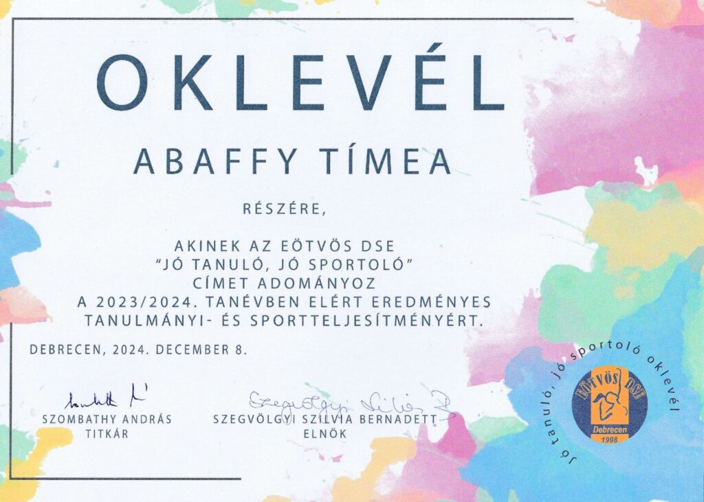 December 8-án a DSZC-Eötvös DSE – GLP Nyíregyháza NB II-es bajnoki mérkőzés előtt Abaffy Tímea, végzős diákunk, a 2023/2024. tanévben elért teljesítményéért „Az Eötvös DSE jó tanulója – Jó sportolója” elismerésben részesült.