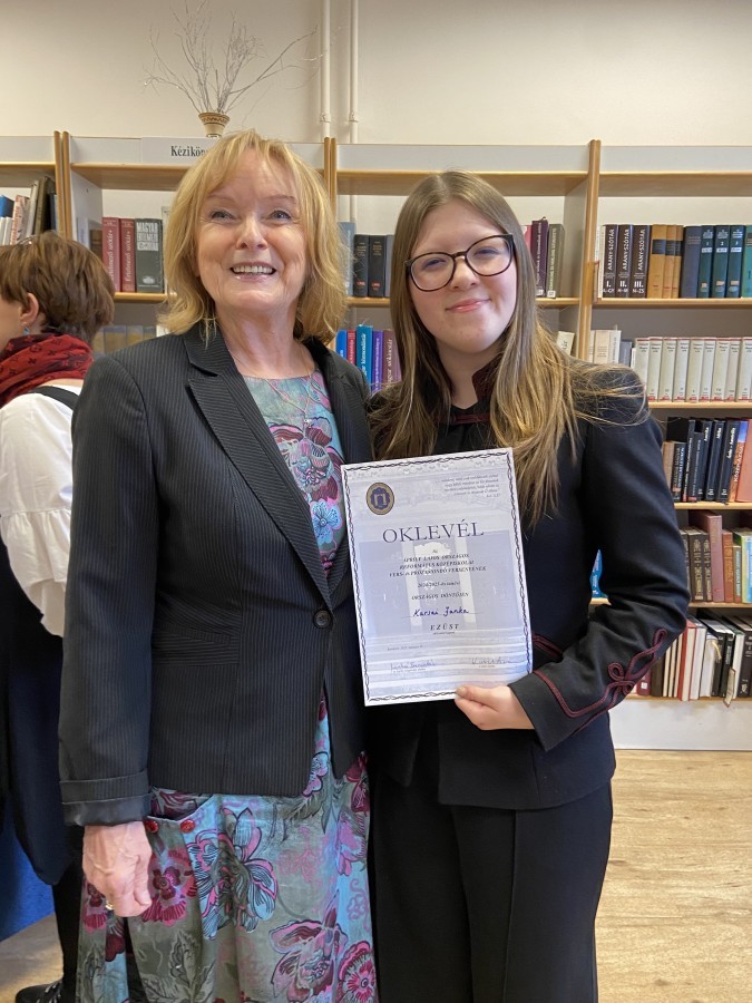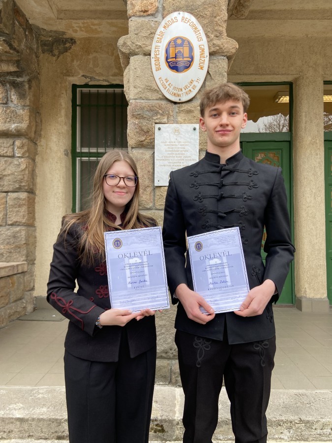 Március 22-én a budapesti Baár-Madas Református Gimnáziumban a 30. Áprily Lajos Vers- és Prózamondó Versenyen két diákunk szereplését is elismerte a Kazinczy-díjas előadóművészekből álló rangos zsűri. Kubik Anna színművész, Matula Ágnes tévés műsorvezető és Lázás Csaba rádióbemondó kiemelte az értő és érző versmondást. A református középiskolák legrangosabb országos versmondó versenyének döntőjén Karsai Janka (12. d) ezüst minősítést, Márton Zalán (10. a) arany minősítést és a közönségdíjat kapta meg. (felkészítő tanárok: Usztics Anikó és Kovács Gergely)