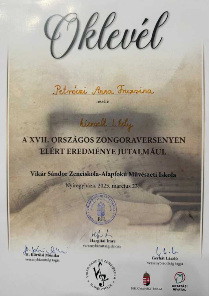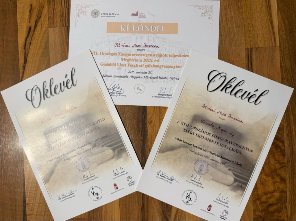 Petróczi Anna Fruzsina (12.B) a XVII. Országos Zongoraversenyen kiemelt első helyet és 3 különdíjat nyert el, amelyek igen jelentősek voltak. Meghívást kapott ugyanis a 2025. évi Gödöllői Liszt Fesztivál gálahangversenyére,