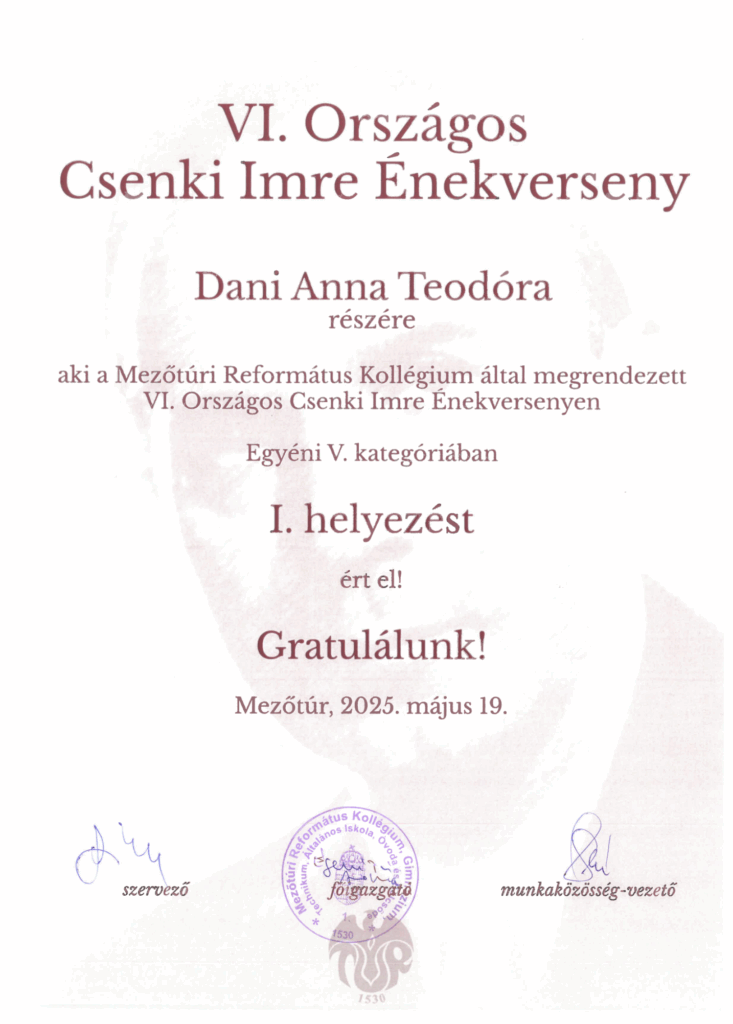 A Mezőtúron megrendezett VI. Országos Csenki Imre Énekversenyen idén 460 diák mérette meg énektudását. Gimnáziumunkat 3 diákunk képviselte; mindnyájan szép eredményt értek el.