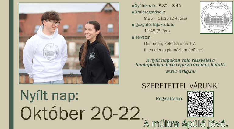 Kedves Nyolcadikosok! Szeretnétek tudni, hogy milyenek az órák egy olyan iskolában, amely több mint 485 éve folyamatosan működik Debrecen belvárosának szívében? Belekóstolnátok a nálunk lévő diákközpontú légkörbe? Szívesen megkérdeznétek egy diákot arról, hogyan telnek a hétköznapjaink, milyenek a tanárok és a kolis élet?