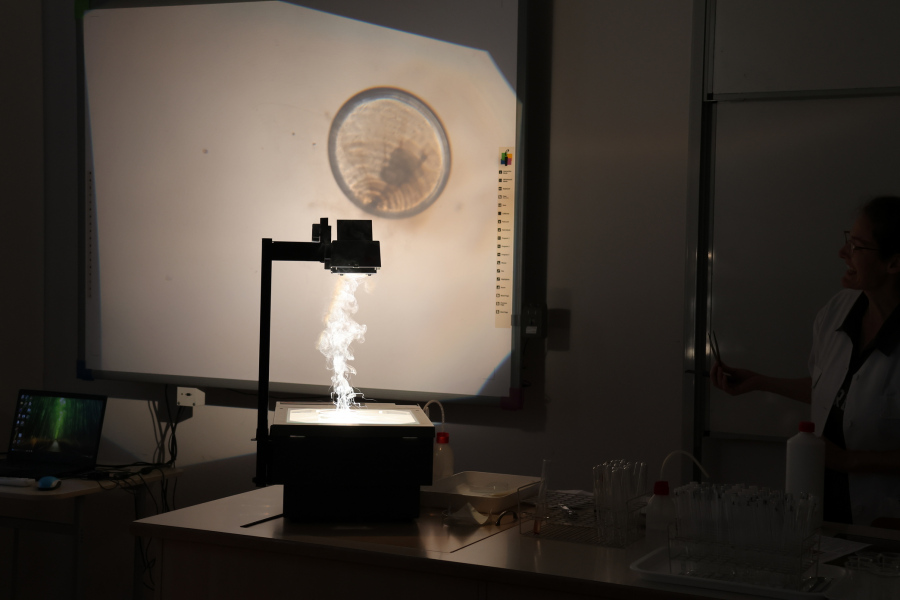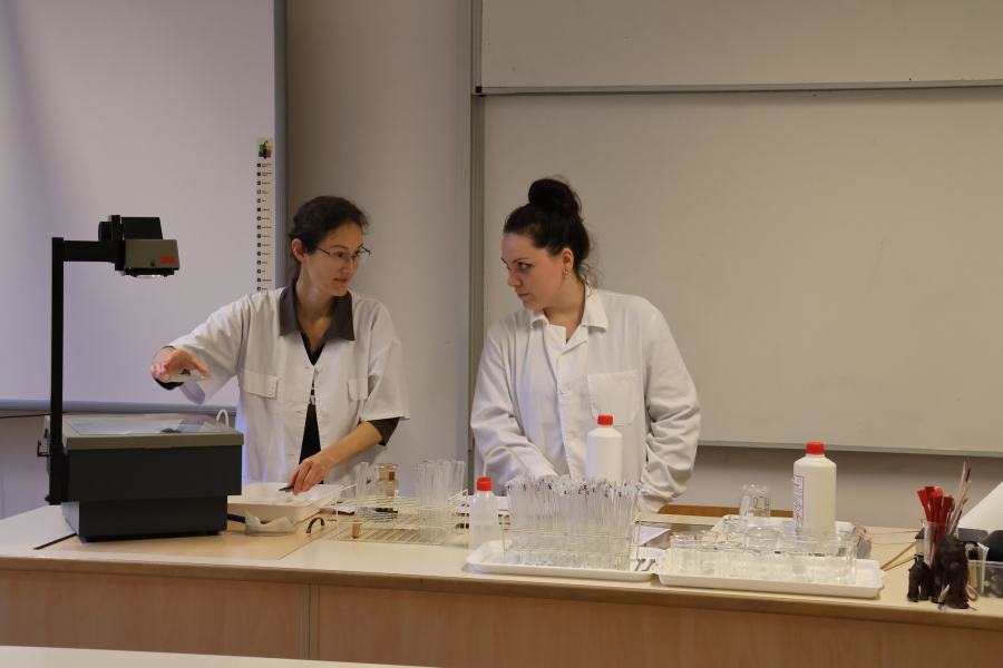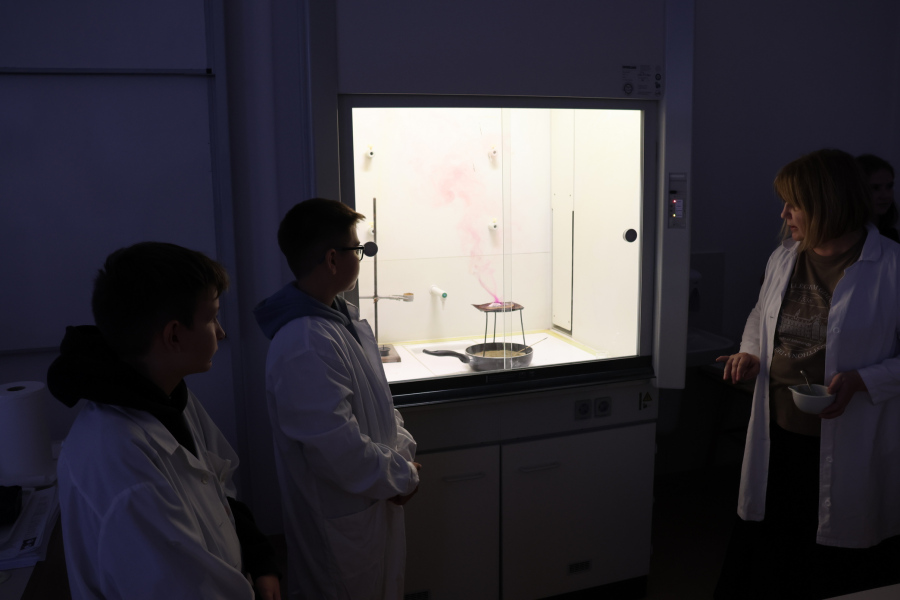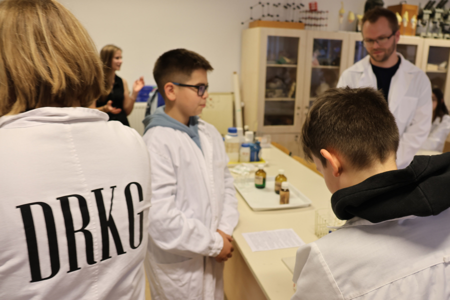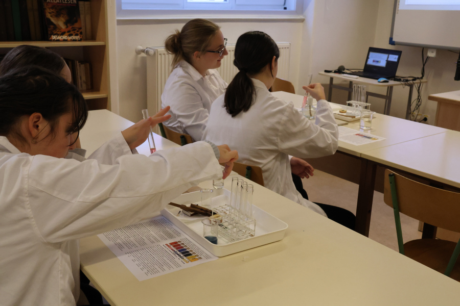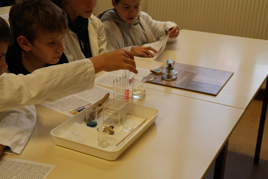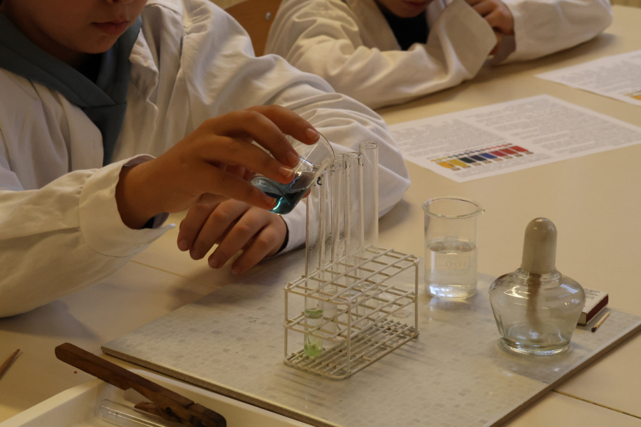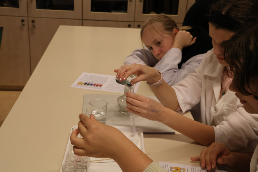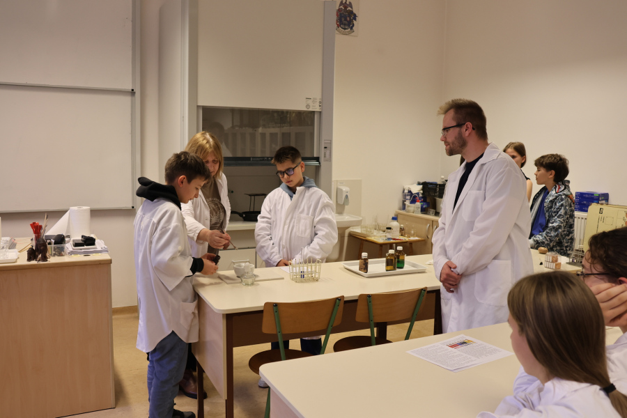 A biológiai foglalkozás után színpompás kísérletekkel kápráztatta el az általános iskolás diákokat kémiatanár csapatunk. Sőt maguk a fiatalok is kipróbálhatták magukat vegyésztanoncként miközben lelkesen öntögették a kémcsövek tartalmát – természetesen szigorú felügyelet mellett. 🙂
