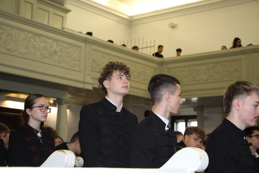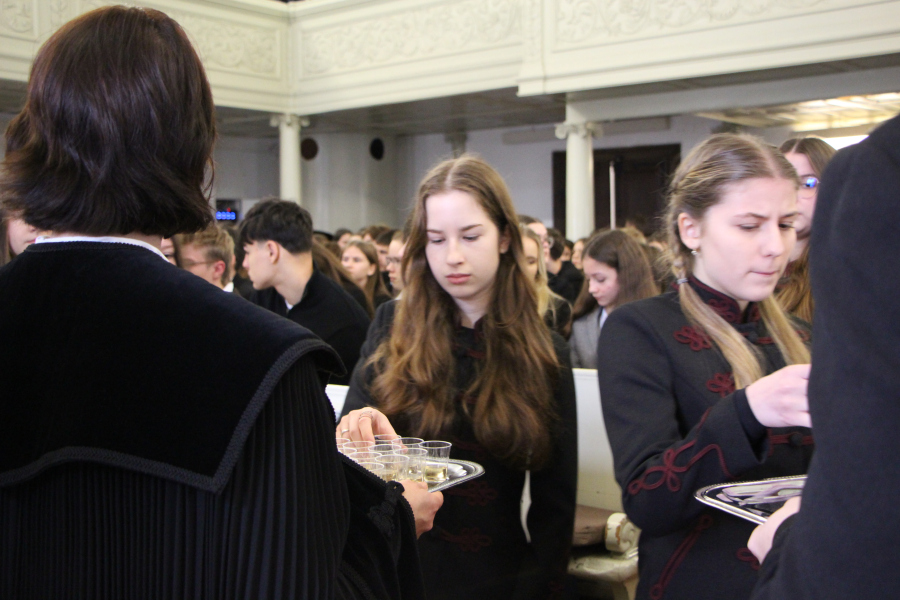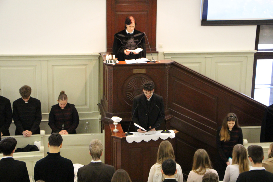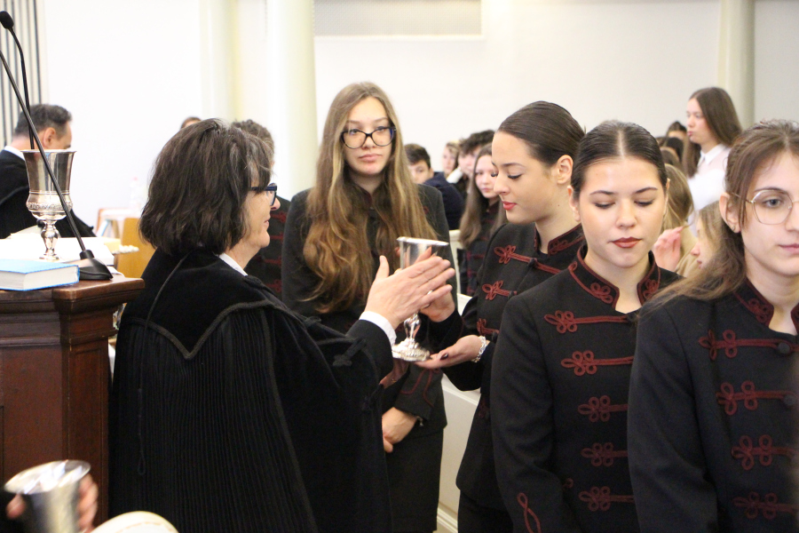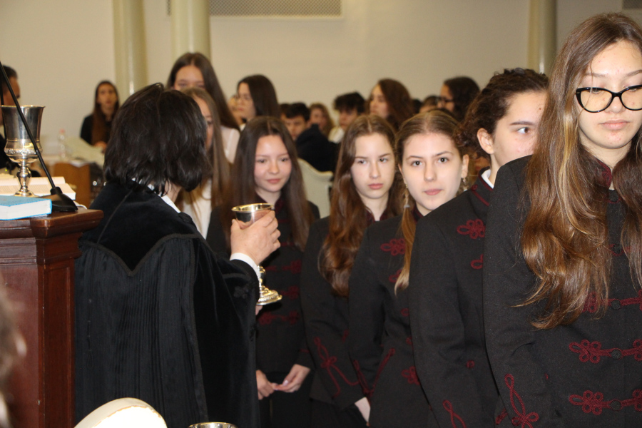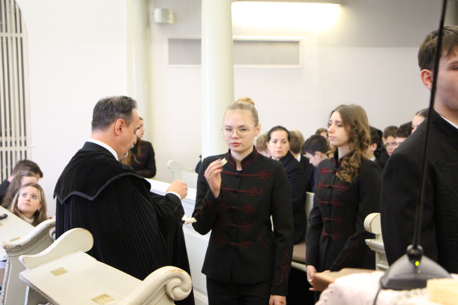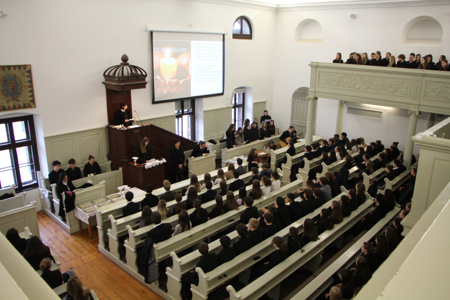 Advent első vasárnapján hagyományainkhoz hűen úrvacsorás istentiszteletre gyűlt össze tanári karunk és az ifjúság. Ezúttal a zenekar színvonalas szolgálata is színesítette ezt lelki üzenetben bővelkedő alkalmat. Az igehirdetésben az iskolalelkész az angyali üdvözlet történetén keresztül a tudatos, belső csendben megélt istenvárásra hívta fel a diákok figyelmét ebben a hangos, színpompás élményekkel túlterhelt világban.