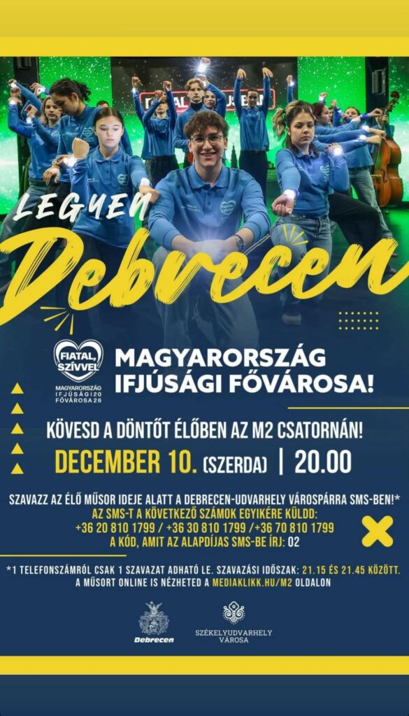 Támogassuk együtt szívvel-lélekkel Debrecent és Székelyudvarhelyet, legyünk mi Magyarország Ifjúsági Fővárosa! Küldjétek szavazatotokat a Debrecent képviselő csapatra, melynek kulcsembere Pásztori László, 10.d osztályos diákunk!