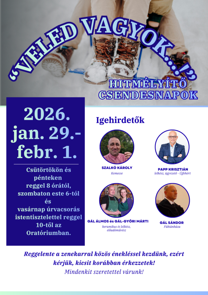 Vasárnap szintén egy diákunk édesapja, Gál Sándor hirdeti majd az Igét, és úrvacsorai közösségre gyűlünk össze 10 órától az Oratóriumban. Minden alkalomra szeretettel várjuk fiataljainkat.
