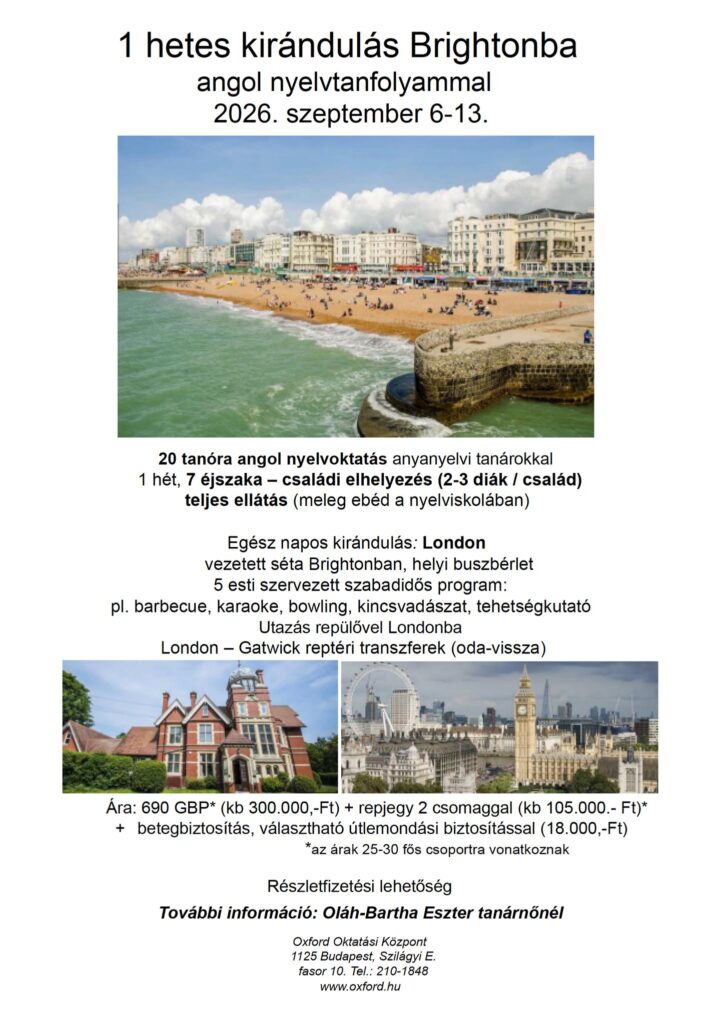 Iskolánk diákjainak lehetősége van részt venni egy 1 hetes intenzív nyelvtanfolyamon, szeptember 6-13 között, Brightonban.