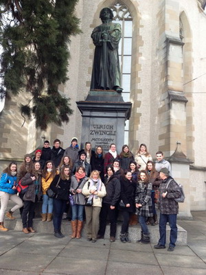 Először vasárnap reggel Ausztriában, Melkben álltunk meg, ahol tettünk egy kis sétát, fáradt végtagjaink felfrissítéséért. Délutánra értük el Kufstein várát, ahol megnézhettük többek között azt is, hol tartották Kazinczy Ferencet fogva. Este hatkor érkeztünk meg Schiers-be. Kedves fogadtatásban részesültünk. Ezután elfoglaltunk a szobánkat a kollégiumban, majd vacsorázni indultunk. A hosszú út után mindenkinek jól esett vacsora után a kényelmes ágyikóban lepihenni. Hétfő reggel az iskolába vettük az irányt, „EvangelischeMittelschule-Schiers”. Különböző tanórákon vettünk részt, betekintést nyerve az ottani diákéletbe. Tanítás után Grüschben látogattuk meg a helyi múzeumot. Ezután mindenki a vendéglátó családhoz utazott. Kedden a svájci médiából csipegettünk híreket. Délután pedig szánkózni vittek minket Klosters-Gotschnaba. Mindenkinek nagy élmény volt a magas hegyről leszáguldani, igaz kisebb-nagyobb sérülések árán. Szerdán iskola után Zervreilaba utaztunk a vízierőműhöz. Csütörtökön St. Gallenben csodálhattunk meg egy lenyűgöző barokk építésű templomot és Svájc legrégebbi könyvtárát. Ezután a Rajna-vízeséshez vezetett utunk. Ez Európa legnagyobb vízesése. Következő megálló Stein am Rheinban volt. A városnézés után kisebb csoportokban is felfedezhettük a környéket. A hét utolsó munkanapján iskolapadban kezdtük a napot. Megnézhettük, hogyan folyik iPaddel a tanítás. A délutánt sportolással töltöttük. Unihokizásra és kosárlabdázásra került sor a tágas tornateremben. Este mindenki lázasan készült visszamenni a családjához, ez volt ugyanis az utolsó éjszakánk náluk. Szombat reggel mindenkinek nehezére esett a vendéglátóitól elbúcsúzni, mivel nagyon összebarátkoztunk a gyerekekkel, szülőkkel. Ez az egy hét nagyon sokat fejlesztett a nyelvtudásunkon, mivel a családoknál a társalgás németül folyt mindig. Ez nem jelentett problémát, közösen társasjátékoztunk, beszélgettünk minden este a családtagokkal. A könnyes búcsú után visszaérkeztünk a kollégiumba. Gyors kipakolást követően azonnal indultunk a buszhoz, ami Zürichbe szállította kis csoportunkat. Itt többek között az egyetemet, Ulrich Zwingli szobrát és különböző templomokat csodálhattunk meg. A közös program után kaptunk egy kis szabadidőt, amit mindenki kedve szerint használhatott ki.